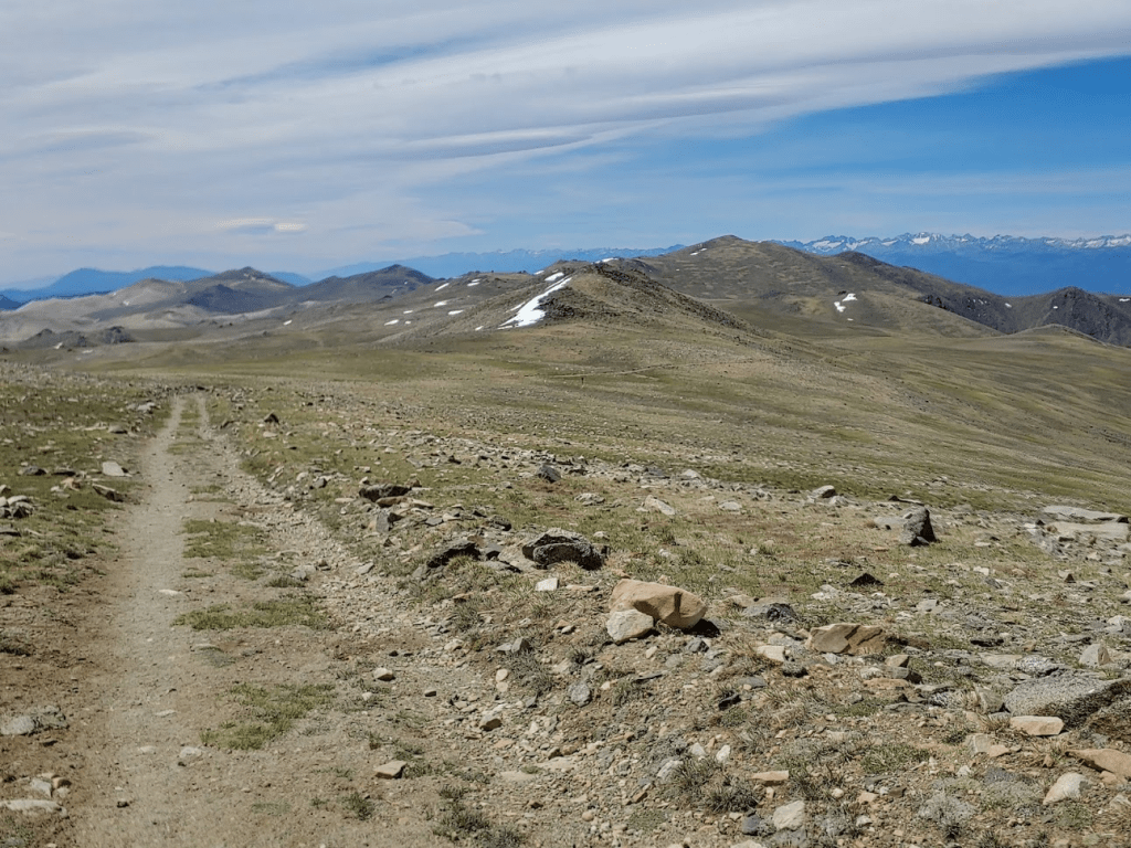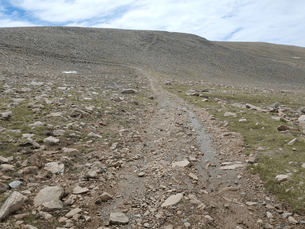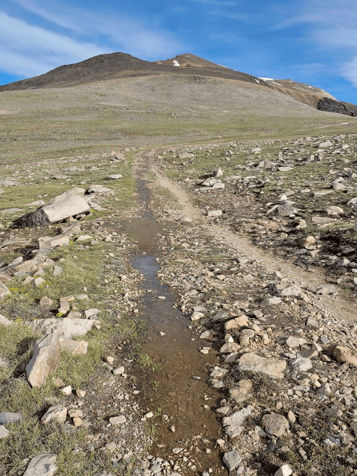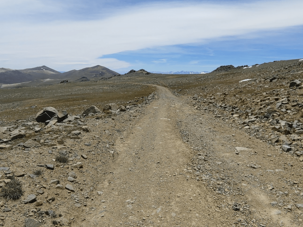 The road then steeply descends about 200 feet. At 5.52 miles I reached the low point before the final climb at 12,941 feet. This portion of road was wet from snow melt.