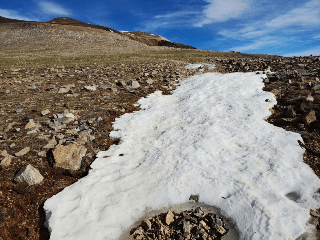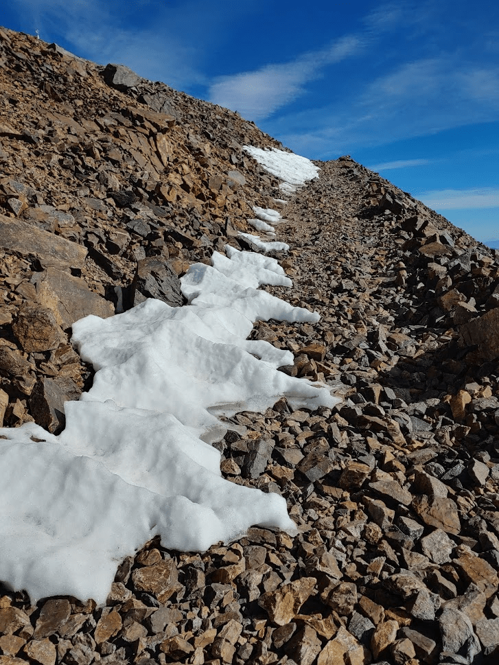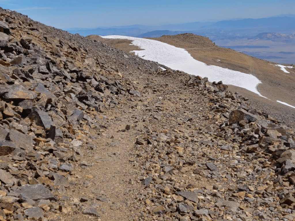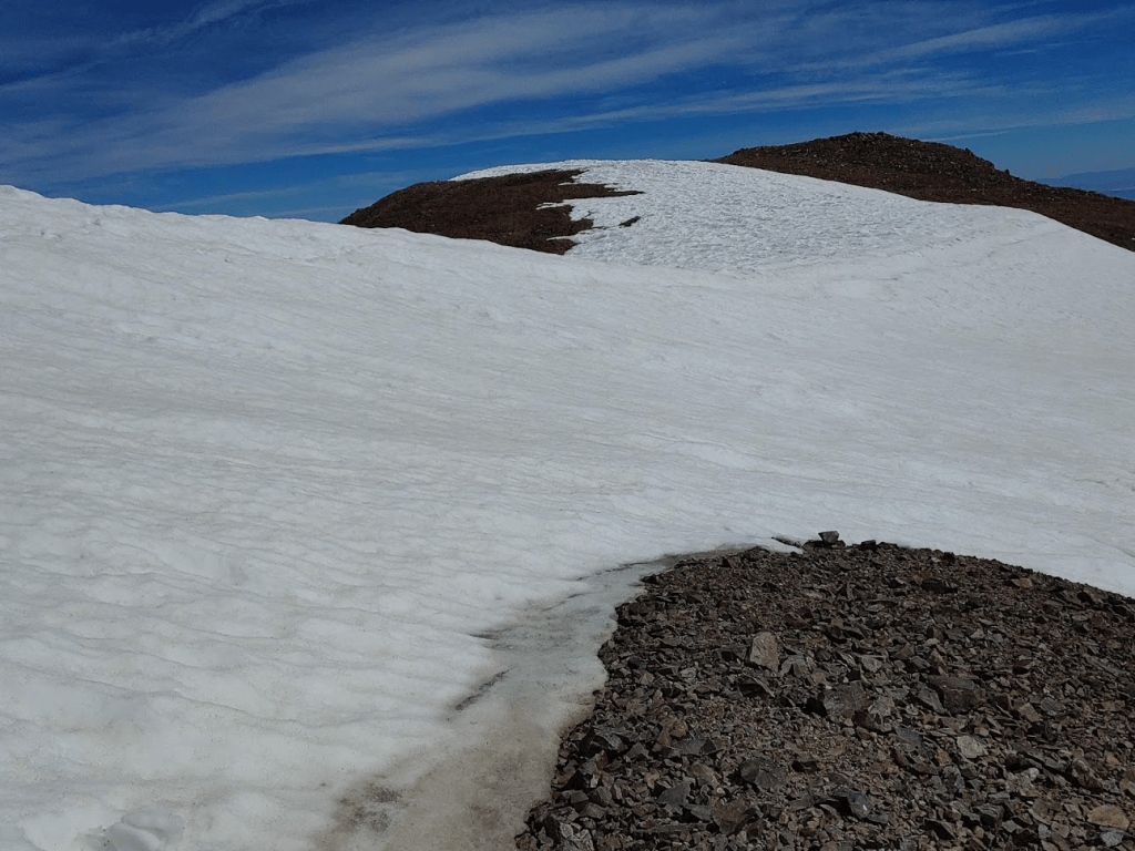 At 7.06 miles the 2 runners from before passed me on their way down. They warned of a large snowfield a short distance ahead, but they said they found a ducked use trail that could be used to bypass the snow.