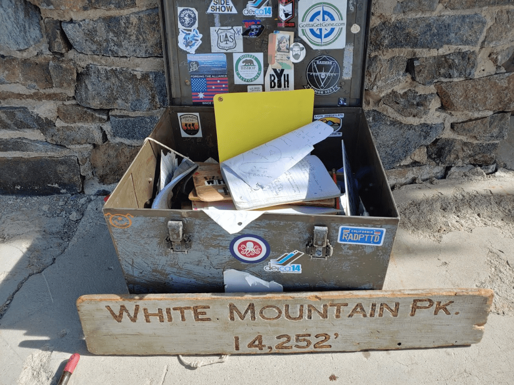 At 13.71 miles I reached the summit at 12:12pm! I signed the register from 2007 and noted there were a few entries from today. This peak, while much less popular than White Mountain Peak, still sees a decent amount of traffic. The view of White Mountain Peak to the north was spectacular.