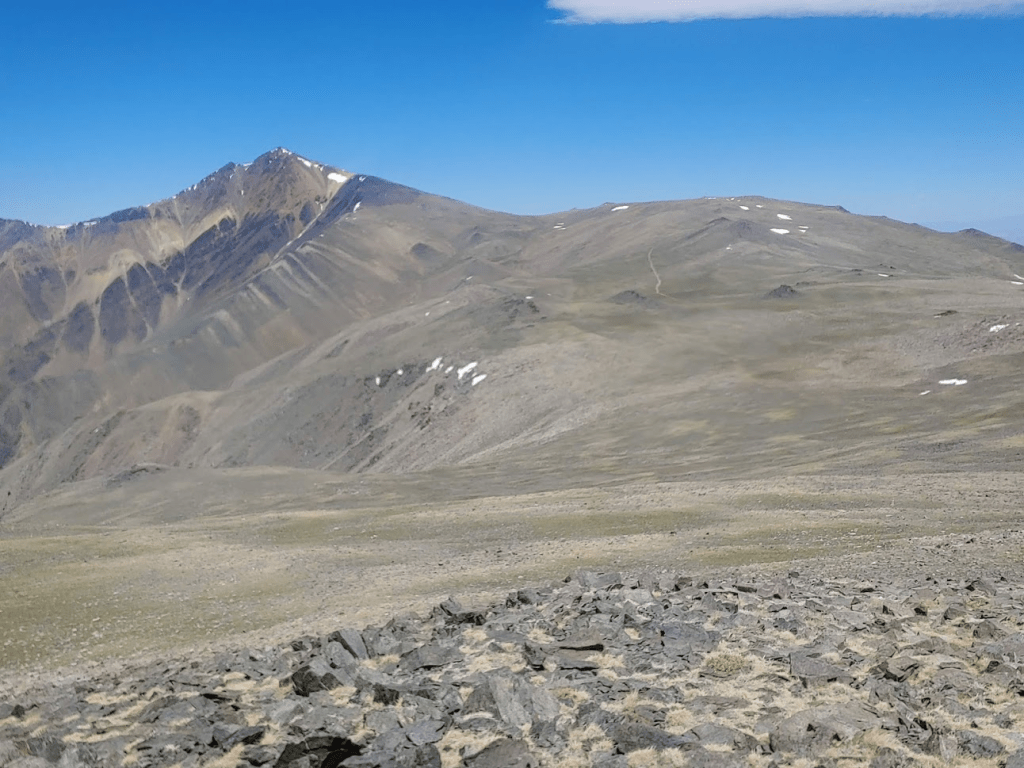 The next 800 feet to Kelty Peak was very steep. I followed a sandy use trail up to about 10,000 feet before it petered out. My legs were already starting to feel tired, which was mildly concerning considering how far I still had to go. I eventually made it to the top of the steep slope after taking a few breaks along the way. I reached the summit of Kelty at 9:25am at 7.94 miles.