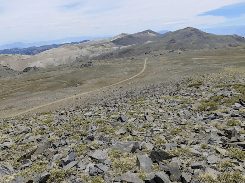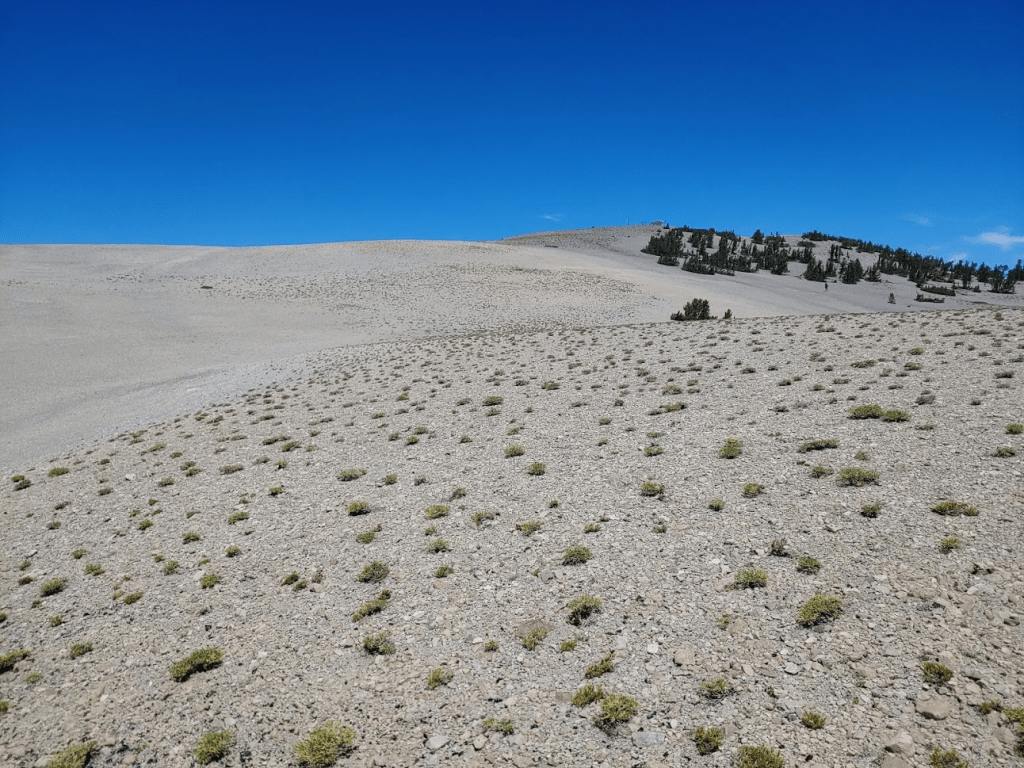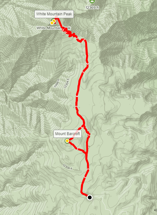 I passed a few more groups of hikers on their way up over the next couple miles. They were mostly pairs or solo hikers. At 12.92 miles I left the road to make my final detour of the day. About ¾ of a mile directly west of the Barcroft Facility is a 13, 040 foot peak called Mount Barcroft. It’s not an especially prominent peak but it is included in Zdon’s book, so I decided to climb it quickly on my way back.