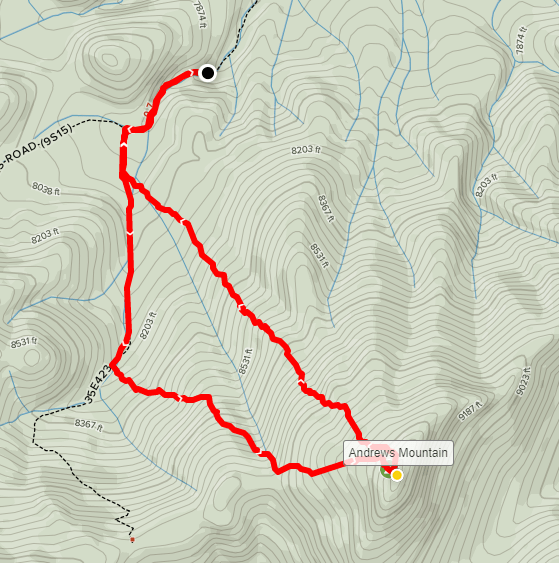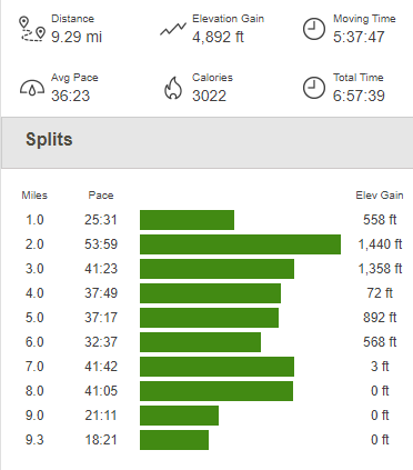 The temperature had been very pleasant for most of the day, but really started to warm up as I descended. I reached the car again at 2:17pm. This hike totaled 9.29 miles, 4892 feet elevation gain, and 6:57:39 total time.