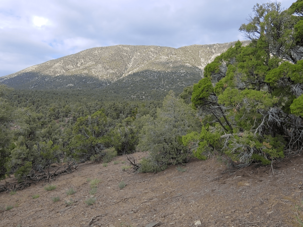 I started off hiking west through a pretty dense forest of pinyon and juniper, a very typical landscape for the high desert. At 0.4 miles I passed a sign indicating I was now in Inyo National Forest. I believe I was actually parked in a remote corner of Death Valley National Park.