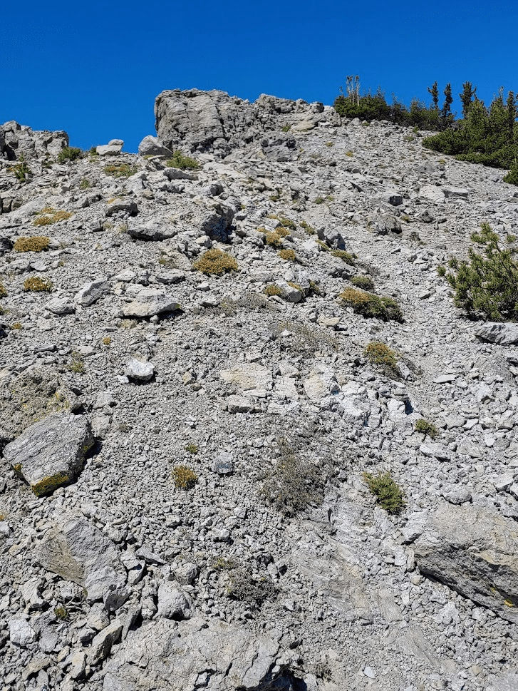 As I was leaving the summit, I noticed a few scraps of paper stuck inside a bush. I got closer and realized it was the register. I didn’t see a jar or any sort of canister nearby. The pieces of paper were somehow still dry. I couldn’t believe they hadn’t blown away in the wind. I managed to sign it and then tucked it underneath a rock near the summit. After dealing with the register, I descended about 200 feet to another saddle.