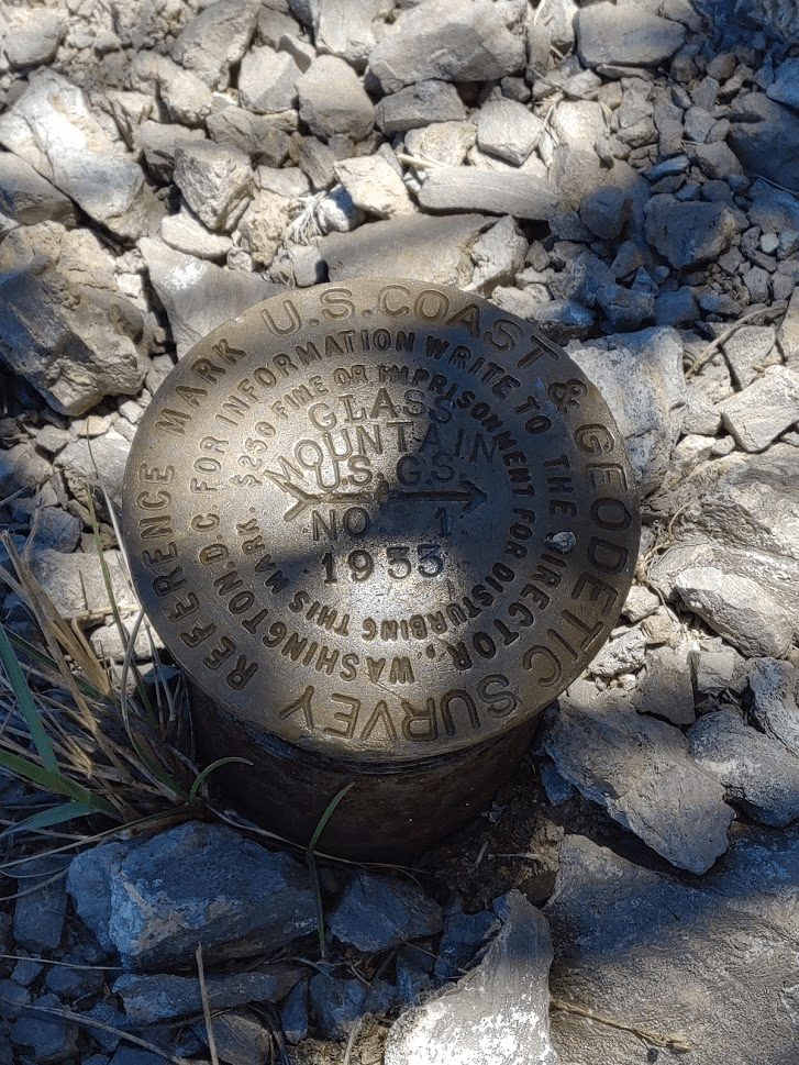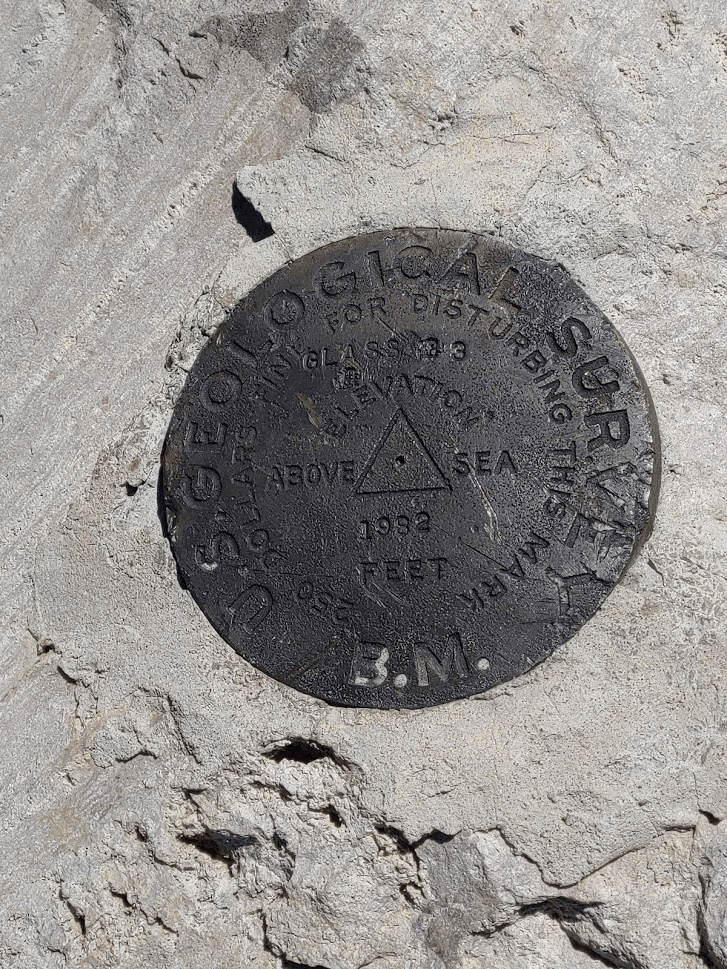 I reached the north summit at 12pm exactly! It had taken 20 minutes to hike ¾ of a mile between the 2 peaks. The slightly lower north summit is actually where the map is labeled as Glass Mountain, which is weird. This summit also contains the USGS markers – I located a benchmark and 2 reference markers.