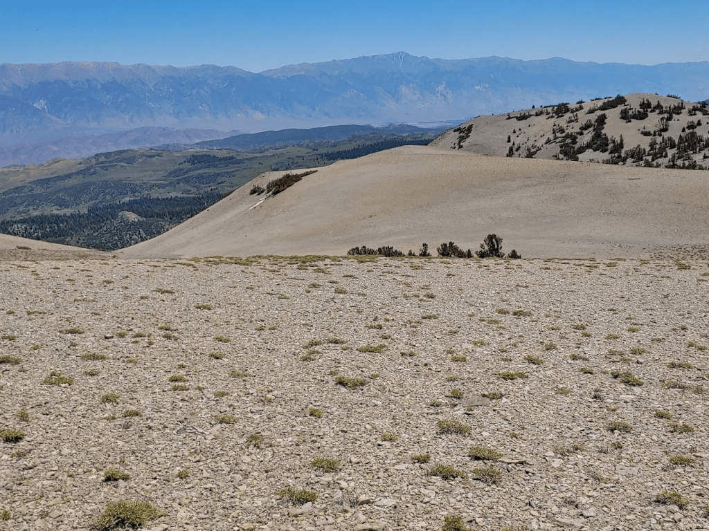 After a long slow climb, I finally reached the main ridgeline. I turned north and hiked the short distance to the summit. I reached the top at 9:35am at the 3 mile mark. It was quite hazy, so the views weren’t that great. I could barely see White Mountain Peak far to the north.