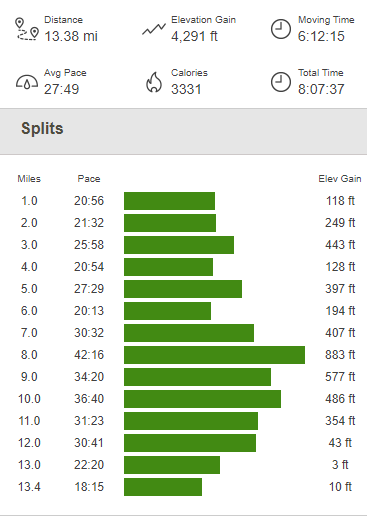 I reached the car again at 1:25pm, exhausted but triumphant. This hike totaled 16.13 miles, 3901 feet elevation gain, and 8:10:26 total time.