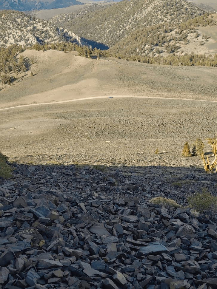 Looking north, I could see White Mountain Road winding its way up to Patriarch Grove and the White Mountain Peak trailhead.