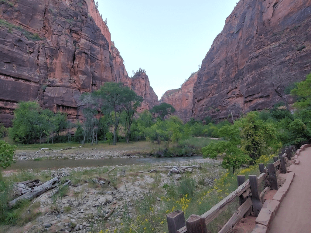 My plan for my first day in Zion was to hike The Narrows, which is one of the most iconic hikes in the American Southwest. The hike goes through the narrowest section of Zion Canyon, with walls on either side of the narrow gorge rising 1000 feet or more. The hike involves actually getting wet and hiking in the Virgin River. I had made a reservation for some rental gear a few weeks prior, so the night before I drove to Springdale to pick up waterproof boots and socks, dry pants, and a walking stick. It cost $57 to rent all of it for one day from Zion Adventure Company, one of the local outfitters. The gear all worked great, and $57 isn’t a bad price, so I would recommend. I woke up at 5:15am and drove to the Zion National Park visitor center where I waited to catch the shuttle bus up the canyon. No private vehicles are allowed within the canyon, so shuttle bus is the only way to reach the trailhead for the Narrows. I had to buy a $1 shuttle ticket from the National Park Service a few weeks prior to my trip. I’ve never been to Zion, so not sure what the system was before, but I think the whole $1 ticket thing is because of decreased capacity on the busses due to Covid. Anyway, I got on the first shuttle into the canyon at 7am. It was still very dark out, but gradually started to get lighter as the bus made its way up the canyon. I got off at the last shuttle stop – the Temple of Sinawawa and started my hike at 7:33am.