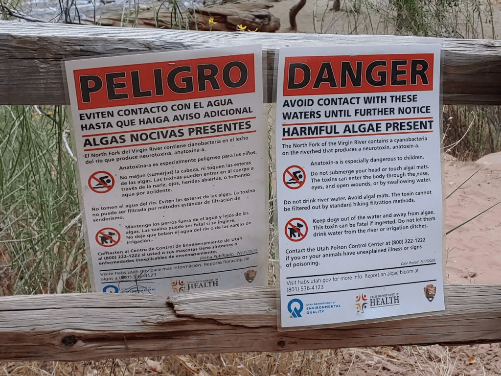 The trail follows a paved path alongside the Virgin River for the first mile or so. There were signs everywhere warning of harmful cyanobacteria in the water. I was aware of this ahead of time – from what I read online there’s no worry as long as you don’t drink the water or submerge your head. I also figured if there was really a serious risk the Park Service would just close off the trail.