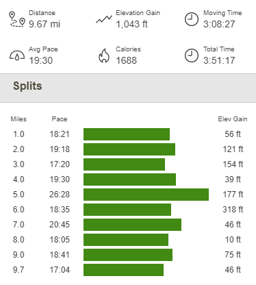I had seen a few hikers on their way back on the hike so far, but I actually had the whole viewpoint to myself. I stayed a while to soak in the views and enjoy the solitude. On the way back, I climbed 2 more minor peaks just off the trail. I reached the car at 6:56pm. This hike totaled 9.67 miles, 1043 feet elevation gain, and 3:51:17 total time.