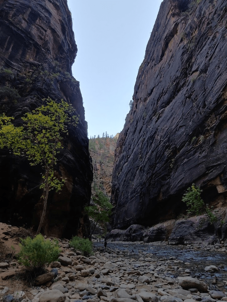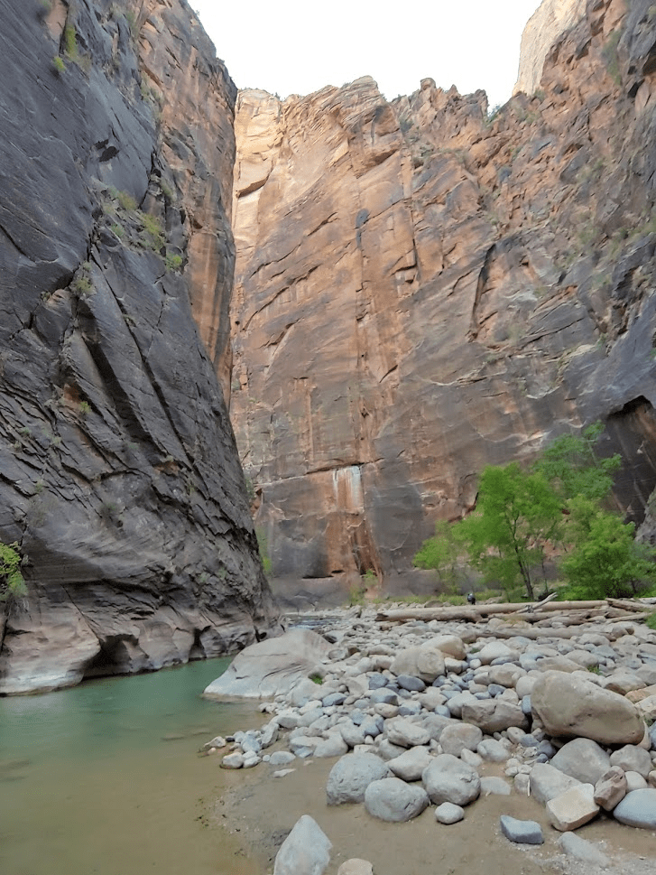 The entire “Narrows” section of the Virgin River is about 16 miles long. Hikers can be dropped off upriver and hike the entire thing “Top-down” as either an overnight or long day trip. However, this requires a backcountry permit that the Park currently isn’t issuing due to Covid. The other option is to hike it “bottom-up” starting at the Temple of Sinawawa shuttle stop (this is what I was doing). Bottom-up hikers are limited to only the first 5 miles of the Narrows (4 miles from the end of the paved trail). I was hoping to hike all 5 miles of this route which ends at Big Spring for a total hike of 10 miles.