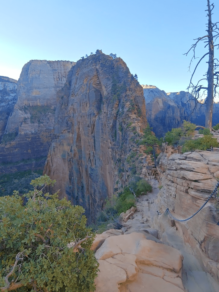 At the top of Walters Wiggles, I made it to Scout Lookout at about 2 miles. The final half mile to the summit is known as the “Chains” section. It is a class 3 climb along a narrow spine with steep drop-offs on either side. Fixed chains have been installed by the Park Service to help hikers safely make it through this section. The chains had actually been closed for the last few months due to Covid but just reopened within the last week or 2. I was very happy about that – it would have been a bummer to drive all the way to Zion and not be able to climb Angels Landing.