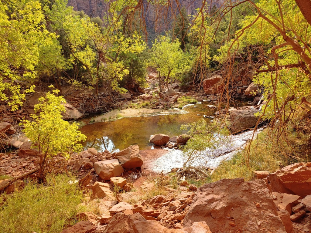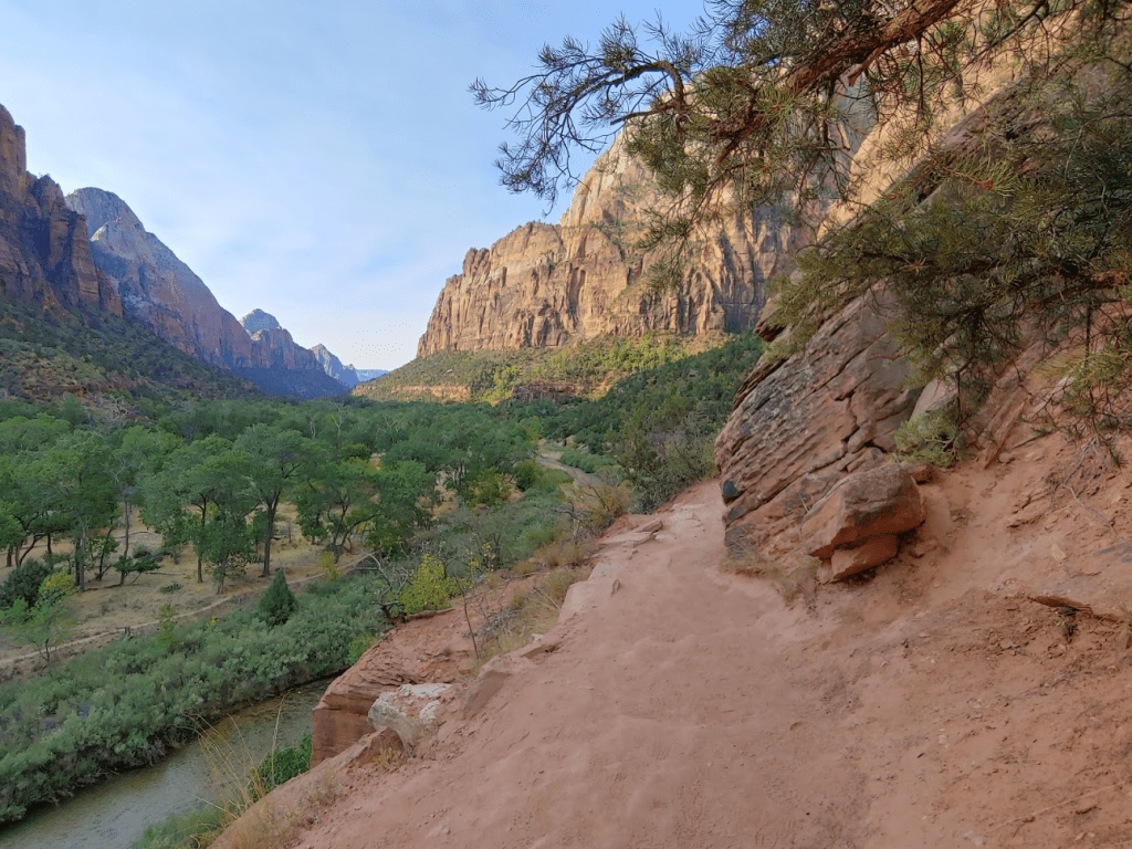 At 5 miles I reached the bottom. Rather than cross the Virgin River and return to the shuttle stop, I decided to keep hiking. My plan was to continue south on the Kayenta Trail towards the Emerald Pools, then cross the river to Zion Lodge, and then return to my starting point via the Grotto Trail. The Kayenta Trail, which thankfully isn’t paved, was very beautiful as it parallels the Virgin River on its way south.