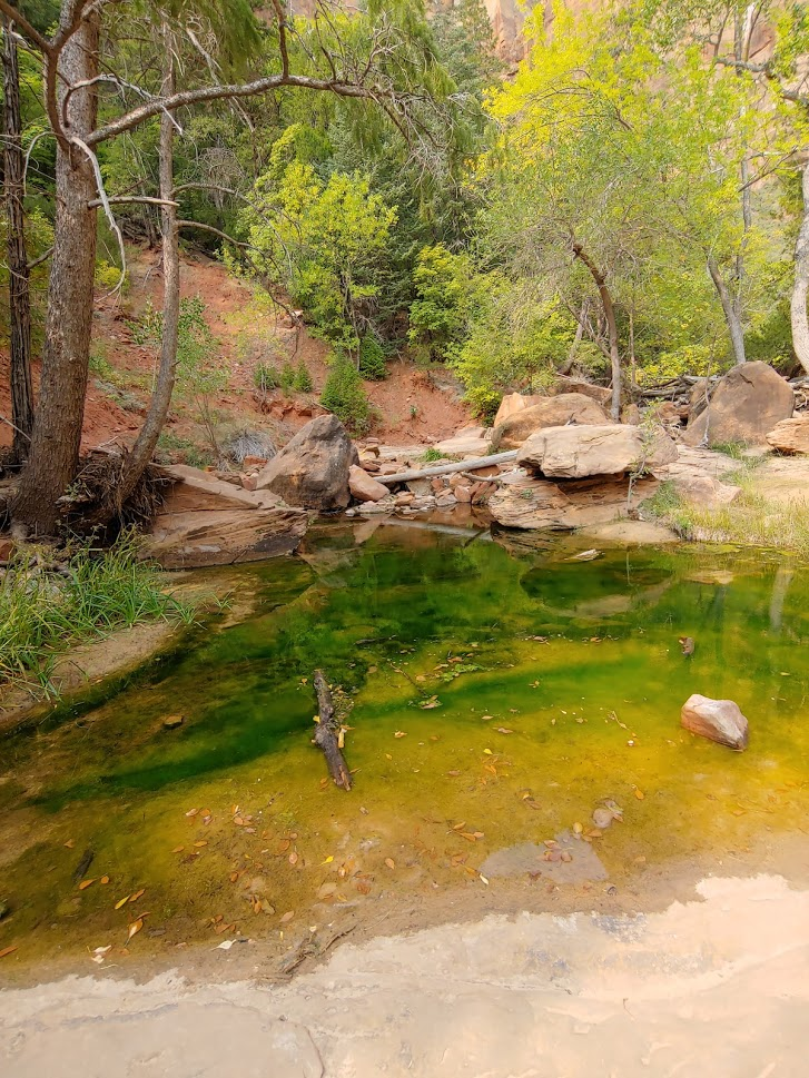 The trail was slightly uphill. It was still shady in the canyon as the sun wasn’t high enough yet to get over the walls. It took about a mile to reach the Emerald Pools area. There are 3 pools, so I decided to visit the lower pool first.