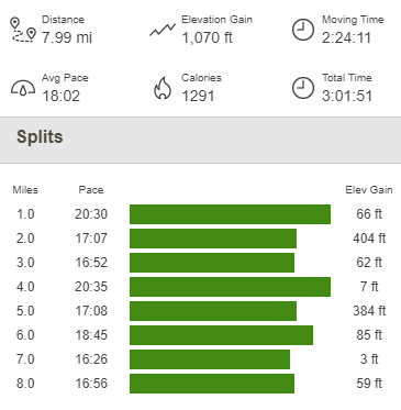 I then hiked back to the trail and retraced my steps to the trailhead. This hike totaled 7.99 miles, 1070 feet elevation gain, and 3:01:51 total time.